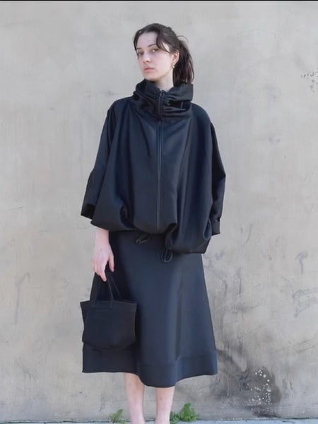 The Navigation Jacket - A classic Jasmin Shokrian Silhouette which has appeared in many collections- Shown here in a fine Silk wool in Black.  The sheen of the silk wool is contrasted here with a technical zipper, and gathers at the hem with a finished leather chord. Wear the Cuff Folded up or down for different looks- This Jacket is a beautiful evening Jacket.