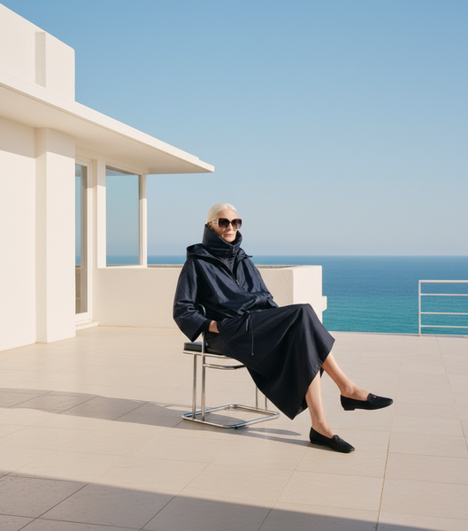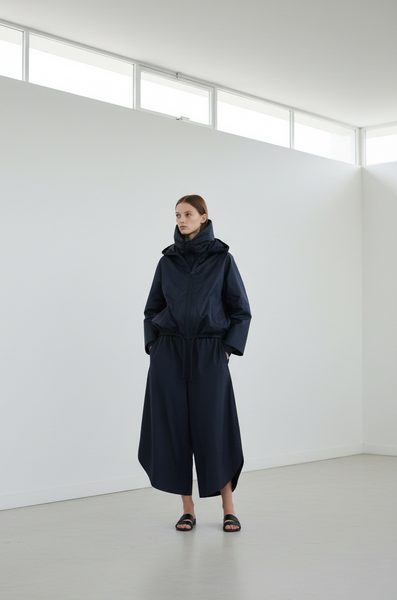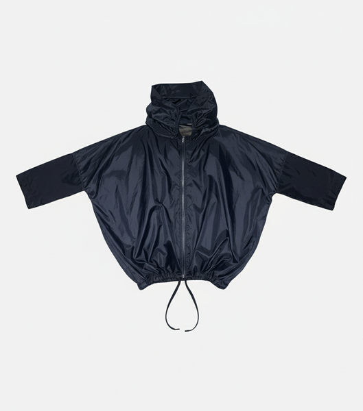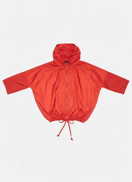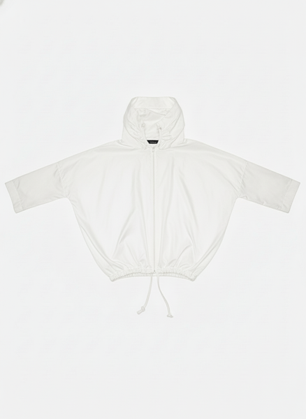 Water-resistant ripstop nylon. Architectural volume through the body, three-quarter sleeves, adjustable covered  chording at waist.
