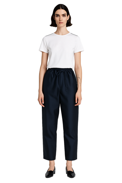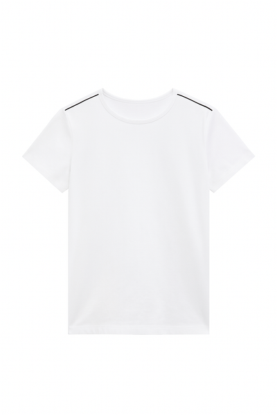 Our Japanese Cotton is back in a classic  Jasmin Shokrian FIT French Cap Sleeve T.  Featuring a drawn  embroidered Line on the shoulders in an inky Blue Black..