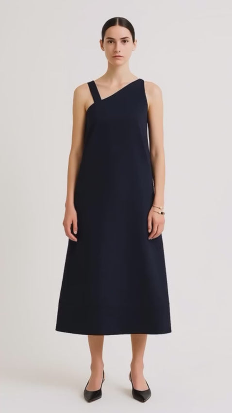In deep midnight blue, The Sail Dress embodies the rhythm of the sea and the discipline of form. Its single strap and asymmetric line echo the geometry of a sail in wind — a nod to the garments Ader wore every day and to Klee’s fluid abstraction of voyage.