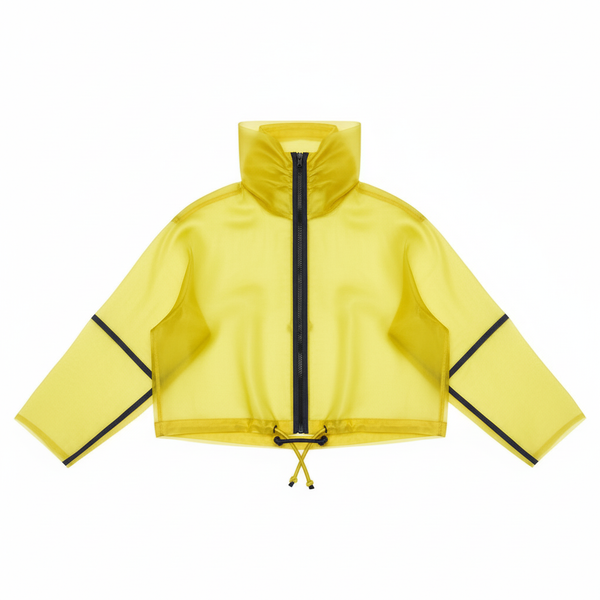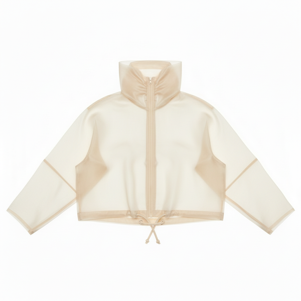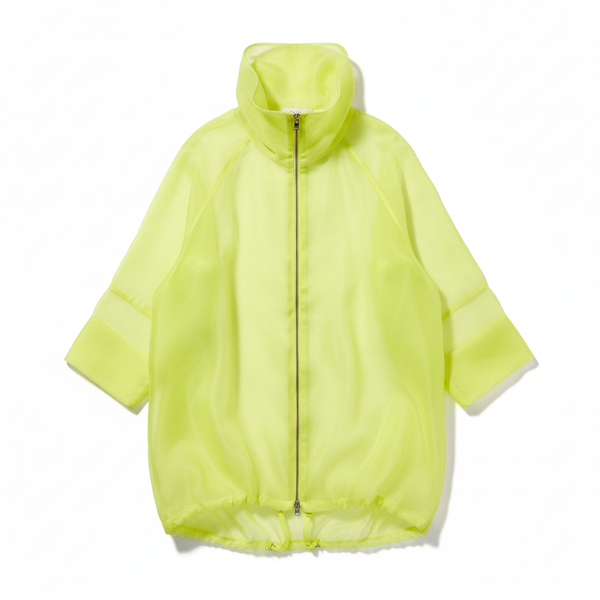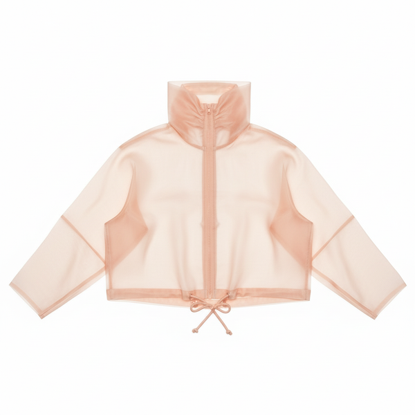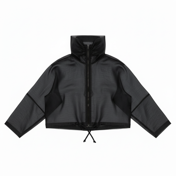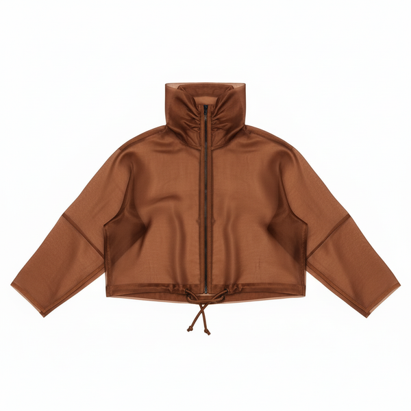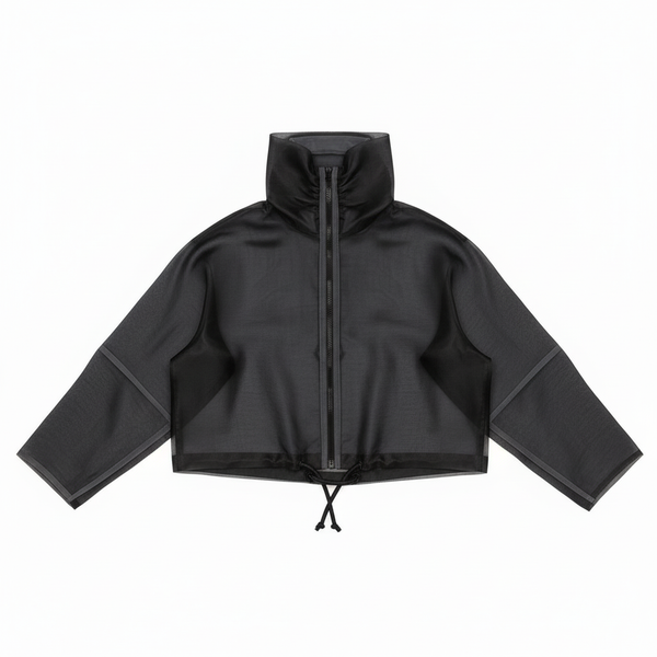 Cropped silk organza jacket. Sheer, structured construction with high sculpted collar and adjustable hem. Floats above the waist.