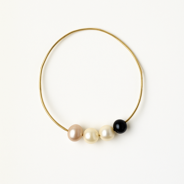 Multi hued Fresh water baroque Pearls, in a palette of blue black, natural and rose shades, floating on an 18K gold filled bangle shares a set with one single Ivory hued floating pearl on a 18k gold filled bangle.